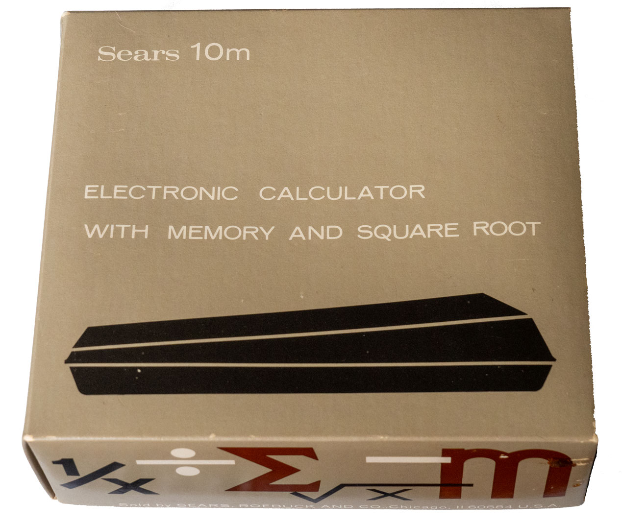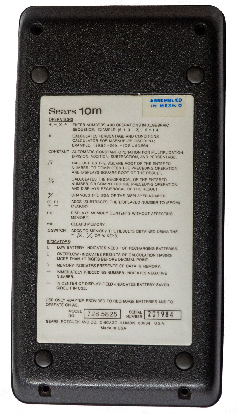 Sears 10m (Model No. 728.5825) (Large Image, Back, Internal, Box, Case) (1974) "Electronic Calculator with Memory and Square Root" sold by Sears, Roebuck and Co. The back plate states at the bottom "Made in USA" although on top of the back plate is an additional sticker that states "Assembled in Mexico." This calculator was originally purchased on July 5, 1975 from Sears for $39.99 according to the original receipt. Adjusting for inflation, that's equivalent to $239.09 in December 2025 dollars. I purchased the calculator with the original box, case and instruction manual on eBay on January 27, 2026 for $4.99 plus tax. Shipping was free! An AC adapter/charger was not included. Inside the calculator has three NiCad batteries which are a bit past their prime after 50 years! I tested the calculator with a temporary battery pack with three AAA NIMH batteries. NIMH batteries have the same nominal voltage as NiCad batteries of 1.2 volts. The measured voltage for the three freshly charged AAA NIMH batteries was 4 volts. The calculator worked with this battery pack attached to the positive and negative terminals inside the calculator. | The calculator, case and box are all in very good condition. The calculator has an "Optostic" red LED display. The calculator has a "large scale integrated circuit" which you can see looking sideways into the back of the calculator. I did not try and pry the circuit board off to view the inside further, however, for fear of damaging the calculator. I'll be on the lookout for another one which I might try and take apart since I have found any internal images on the Internet. Calculator.org and calcuseum.com have brief descriptions of the calculator.