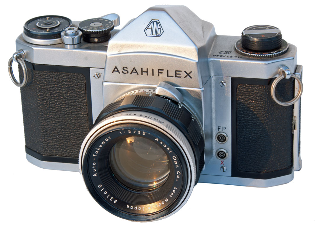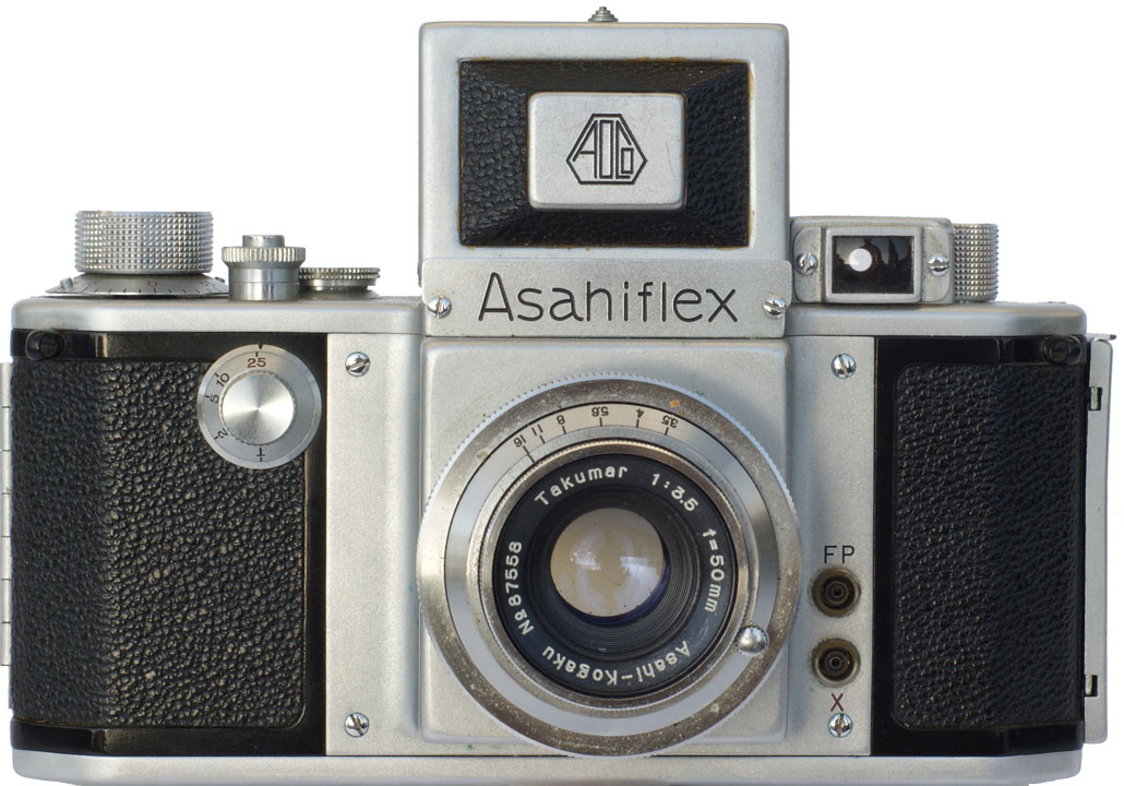 | Asahiflex. Asahi Optical Company started in 1919 making eyeglass lenses followed by movie camera lenses and later binoculars. A late bloomer to cameras, it came in with a splash in 1951 making the first Japanese 35mm single lens reflex camera. In 1951 the rangefinder was still king. Those using 35mm single lens reflex cameras were largely limited to German Exakta and Praktica cameras. Asahi's entry of the its Asahiflex, however, marked the beginning of the dominance of Japanese single lens reflex cameras which continues with digital single lens reflex cameras to the present day. While the Asahiflex cameras were single lens reflex, viewing and focusing were done by looking through the ground glass at the top of the camera similar to a twin lens reflex camera. A magnifier was present also like a twin lens reflex camera. The cameras gave a relatively bright clear image with the eye brought to the magnifier for accurate focusing and framing. There was a separate, non-reflex, viewer on top of the cameras for eye level viewing. This, of course, did not allow for focusing and was accurate for framing only with a 50mm lens. It was not until 1957 that Asahi would introduce its Asahi Pentax with its pentagonal prism or "Pentaprism" for eye level, single lens reflex viewing. The pentagonal prism, of course, was the inspiration for the Pentax name (Pentaprism and Asahiflex combined) and over time the company would simply become known as Pentax. It was not until two years later that Nikon, Canon and Minolta would introduce their eye level, single lens reflex cameras. Pentax, along with Nikon, Canon and Olympus, are still major players in the digital SLR market. Pentax was merged into Hoya Corporation in 2008, however, according to Pentax - Wikipedia. Minolta has sold its DSLR camera assets to Sony in 2006 according to Minolta - Wikipedia.