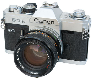 Canon FTb-N QL (Large Image) Introduced in July 1973 according to Canon Camera Museum. This was an improved version of the Canon FTb above. The "N" designation does not appear on the camera or marketing materials at the time, although Canon identifies it as the FTb-N in its Canon Camera Museum where it states: "Improvements include a shutter speed display in the viewfinder, a larger shutter button, a plastic-tipped film advance lever, and a slimmer combination self-timer and stop-down lever." Additionally, the cover for the flash socket on front rotates open while staying on the camera so it cannot be lost. Obviously, this is a minor, but very clever, change! While the shutter speed is now displayed in the viewfinder, the aperture still is not displayed in the viewfinder. Mine is serial number 495538. It includes a 50mm f1.4 Canon FD lens, serial number 740106. The camera and lens were originally purchased for $199.99 on April 2, 1976 at "The Town House" in Agana, Guam according to the receipt that came with the camera. The receipt says "sale," likely reflecting a sales price since the microprocessor controlled Canon AE-1 was introduced the same month. The $199.99 price was $100 less than the price in the 1976-1977 Sears Camera Catalog. The FTb-N is an entirely mechanical camera except for the match needle exposure meter. I purchased mine on December 10, 2011 for $10 at garage sale in the College area of San Diego. It also came with an every-ready case (in poor condition as is common), a Vivitar 85-205 "macro" zoom lens, a Vivitar Auto Thyristor 2600-D flash and owner's manual. The shutter release and the film advance were not operating at the garage sale. That brought the original price down from $20 to $10. Luckily, at home I discovered that it was an easy fix. The collar around the shutter release button which you can turn to Lock or Advance was loose. I think the shutter lock was therefore on and you could not unlock it. I tightened the little screw in the side of collar and was able to then turn it to unlock the shutter release. Once I saw how it worked, I positioned it so it correctly pointed to the A or L. It works fine now. The shutter speeds sound reasonably accurate. The aperture seems to work properly. I put in a new 1.5 volt 625A alkaline battery. The meter seems to work accurately even with the voltage higher than the original 1.3 volt mercury battery. The stop-down lever, mirror lock-up, and self-timer all appear to work properly. They are all controlled by the same lever in front of the camera. The mirror cushioning foam is deteriorating and needs to be replaced. The light seals also could be replaced. Overall, it is a fine camera capable of professional quality results rivaling those of the finest digital single lens reflex cameras today. Admittedly, the digital cameras have no film or processing costs, can fire off several frames per second, store hundreds of photos on a single memory card, shoot at different ISO settings frame by frame, allow for instantaneous review of the image, and produce a digital image which can be edited on a computer and electronically sent across the globe in seconds. | ||||||