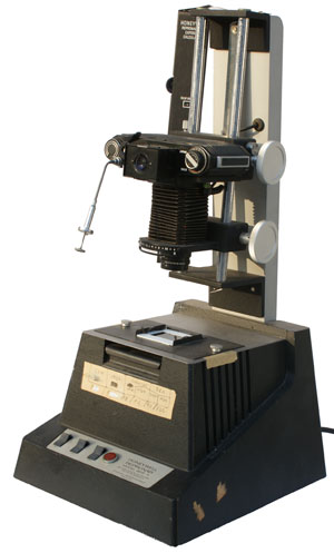 Honeywell Repronar 805 A (circa 1972) (Large image, Camera) A slide copier with a Pentax non-prism single lens reflex film camera (serial no. 10828) with 5cm (50mm) f4 lens (f stops from f4 to f32). The owner's manual for the Honeywell Repronar 805 is available at butkus.org. The bellows and the lens appear to be permanently mounted to the camera. At the base is an electronic flash. There is also a modeling light at the base to see and focus on the image. The lights shine up through the slide towards the lens. There is also a filter drawer to add colored filters to change the color balance. Adjustable voltage from 90 to 270 volts AC. 50 to 60 CPS (cycles per second or Hertz). The camera is made in Japan and is obviously a Pentax although it does not actually say Pentax. The rest of the unit says Honeywell, Denver, Colorado, Made in U.S.A. Honeywell, or its Heiland division, was the importer of Asahi Pentax cameras to the United States for several years in the 1960s. For example, the Honeywell Pentax H3v above was the United States version of the Asahi Pentax SV. While primarily used for copying slides, the Repronar can also be used to photograph other translucent materials like leaves, petals and insect wings. Olympus/Zuiko - "Macro Photography Simplified with the Honeywell Repronar 805 A provides some nice examples often using both the flash from below and natural light from above. It also contains tips on exposure. The camera does not have a built in exposure meter. As stated in that article, "the magnification range is 1/2x, 2/3x 1x, 2x, 3x and 4x." Earlier versions of the Repronar date back to at least January 1963 as indicated in an ad for the Repronar in Science Magazine dated January 1963. AOHC.it indicates the Repronar was first introduced in 1960. Die Cast Pro - Honeywell Repronar 805 A has several nice photographs of the Repronar 805 A. Worthpoint.com states the Repronar 805 A was priced at over $400 in 1972. $400 in 1972 has the same buying power as almost $2,100 in 2010! The price is given as $325 in an August 1975 Popular Mechanics article. The Reponar is largely obsolete today since you would usually use a digital film scanner to copy an image from a slide. I got mine as an addition to my historical collection as well as with the idea of perhaps using it for some creative macro photography. My initial thought that I could just replace it with a digital SLR with a screw mount to e.g. Minolta/Sony Alpha mount adapter. It's not that easy, however, since the bellows and lens are actually fixed on the camera. The camera itself is pretty well fixed onto the rail also. Some have used parts of the system to create some amazing digital macro images such as the insect images at www.microscopy-uk.org, A Macro Stacking Rig by Michael Reese Much. I purchased my Honeywell Repronar 805A on 7-4-10 for $25 in the North Park area of San Diego from an ad on Craigslist. The seller is a photography instructor at UCSD Extension. He indicated he purchased it used it the early 1970s and used it frequently for many years. It is in good working and cosmetic condition. The lens, however, has some white paint splatters. The paint appears to have just missed the glass, however. | ||||||