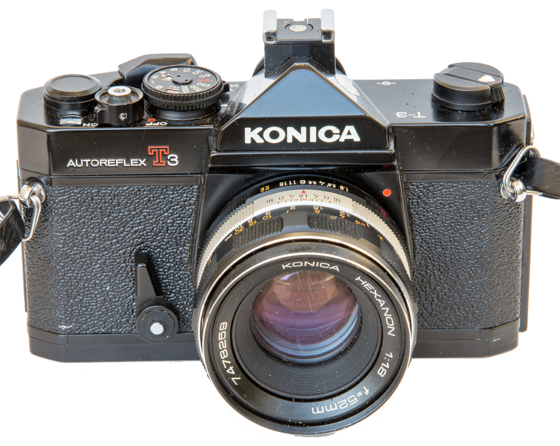 Konica Autoreflex T3 (1973-1975) (Large Image, Back) A beautiful, hefty camera, mine is the black model in fantastic shape weighing in at about 2.3 pounds with the Konica 52mm f1.8 lens. Mine came with the Konica every-ready case. The shutter fires and the speeds sound accurate. It has a vertically travelling metal shutter with shutter speeds from 1 to 1/1000 second. It has open aperture manual metering as well as shutter preferred EE metering with compatible Konica lenses with an EE setting on the aperture ring. The T3 has many high quality features of a classic early 1970s camera including depth of field preview, mirror lock-up function with the timer, and display of both shutter speeds and aperture in the large, bright viewfinder. It was the first Konica SLR with a flash hot shoe, although it was an optional accessory. (Konica Autoreflex T3 - buhla.de.) Mine has the hot shoe. There are also X and M flash contacts. There is a small multiple exposure lever labeled M.E. by the shutter speed dial. This model was replaced by the Konica Autoreflex T3N, although the newer has the same designation on the camera. T3 / T3N Differences - buhla.de lists the differences. Mine is the original model. I don't have the price for the original T3, but the new T3 on page 8 of the 1976-77 Sears Camera Catalog with f1.7 lens sold for $379. $379 in 1976 has the same buying power as about $2,000 in late 2022! The case sold for $19.50. That Sears Camera Catalog page also had the Olympus OM-1 selling for $334 and the Mamiya DSX 1000 selling for $239. The Konica represents the classical 1960s and early 1970s large SLR while the Olympus OM-1 represents the new, slimmer SLR trend. The buhla.de website has a pdf copy of the T3 manual. The T# takes two PX675 mercury oxide batteries which are no longer made. SR 44 siler oxide or LR 44 batteries fit, although they have a different voltage than the PX675 batteries. The buhla.de site has a detailed page of how to deal with this problem. I have not tried the light meter recently although I think it was working. As I write this description in December 2022, I can't remember where exactly I got this camera. It may be from a couple in the Fletcher Hills area of El Cajon who I originally met at a garage sale and who I later purchased a Konica camera as well as several vintage typewriters around 2008. I also purchased a Konica SLR from a gentleman in La Mesa from an ad on Craigslist around the same time frame. It also came with a Chinon 85-210mm f4.5 lens and a Vivitar 352 automatic and manual side mount flash. | ||||||