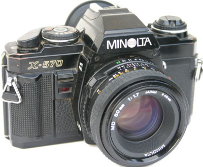 Minolta X-570 (Large Image) introduced in 1983 as a lower cost alternative to the X-700, it actually has several more advanced features than the X-700 including showing both the actual shutter speed and suggested metered shutter speed in manual mode. See Rokkorfiles. While it lacks the programmed automatic exposure of the x-700, it retains aperture preferred automatic exposure in addition to the better manual exposure. Mine includes the sophisticated optional data back and a Minolta autowinder, both of which also work with the X-700. In addition to the Minolta 50mm f1.7 normal lens, my camera also came with two cult classics: the Vivitar Series 1 28mm to 90mm f2.8-3.5 zoom and the Vivitar Series 1 70mm to 210mm f2.8-4.0. The discussion under the Nikon FG has more information about the classic Vivitar Series 1 lenses. The camera with 50mm f1.7 lens was priced at $219.99 in the 1984-1985 Sears Camera Catalog. A Vivitar Series 1 70-210mm f2.8-4 lens was $234.99. (The earlier fixed f3.5 Vivitar Series 1 70-210mm lens was actually much more expensive having a price of $359.50 in the 1980-1981 Sears Camera Catalog.) A non-Series 1 28-85mm f3.5-4.5 Vivitar lens was $179.99 in the 1984-95 Sears Catalog. My camera also came with a very nice Tamrac gadget bag that converts from a shoulder bag to a fanny pack, a Focal 2X teleconverter, a set of Cokin filters and an inexpensive Quantary Q15 flash. Everything appears to be in good working and cosmetic condition. Purchased from an ad in Craigslist near Home Avenue in San Diego on December 8, 2007 for $80. A very nice set up indeed! | ||||||