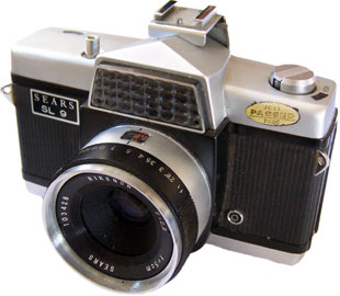 Sears SL9 (1963) is the same as the Ricoh 35 Flex camera. The manual is available online at www.butkus.org. Rikenon f2.8 to 22 with automatic setting. Focal length 5cm (i.e. 50mm). Single lens reflex viewing and focusing with frensel screen and split image. Lens is not interchangeable, but a wide angle and telephoto conversion lenses were available which screwed onto the standard lens. Close focus 2' 8". Seikosha leaf shutter. Selenium meter above lens. ISO range from 25 to 400. Shutter speeds from 1/30 to 1/300 seconds and bulb and automatic setting. Aparently aperture and shutter preferred automatic exposure since automatic setting on both shutter and aperture scales. Aperture and shutter set by sliding bars under lens. Made in Japan. Removable accessory shoe. Camera is clean and in good cosmetic condition. Film advance turns. Unfortunately the shutter does not fire. Pushing up the mirror with your finger reveals that the shutter is stuck in the open position. The aperture also does not appear to change. Purchased on eBay on 11-21-05 for $.99 with $3.30 for shipping and sales tax. | ||||||