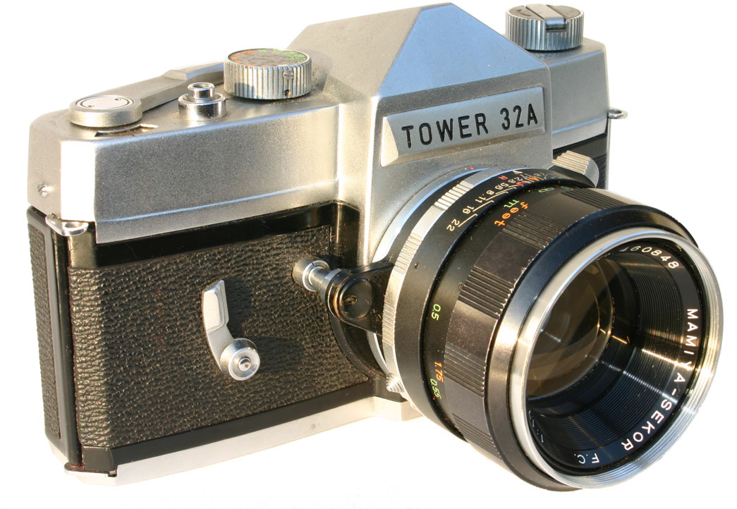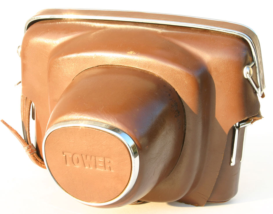 ![]() Tower 32A, (circa 1962) (Large Image). Tower is a Sears brand. The Tower 32A is same as the Mamiya Prismat NP, the first Mamiya 35mm SLR marketed, as explained at Ron Herron's Collecting Mamiya 35mm. Shutter speeds from 1/1000 to 1 second. 58mm f1.9 Mamiya Sekor lens with an Exacta style mount. The projection from the lens on the side with the self timer is the mechanism for opening and closing the aperature. Mamiya had not yet adopted the Pentex screw mount lenses. Canon even made a lens for this camera. Mamiya also made a camera similar to the Mamiya Prismat NP for Nikon called the Nikkorex F as explained at Ron Herron's Collecting Mamiya 35mm. The Tower 32A is a purely manual camera with no light meter and no batteries of any sort. It is in excellent cosmetic and working condition with very little wear. It looks like someone used it a short time and then put it away for the next 45 years! It is missing, however, a circular dial on the back which I believe may have been an ASA film speed reminder dial. It comes with a nice ever-ready leather case also in excellent condition. Purchased on eBay on 7-30-07 for $9.99 plus $11.10 shipping. |
