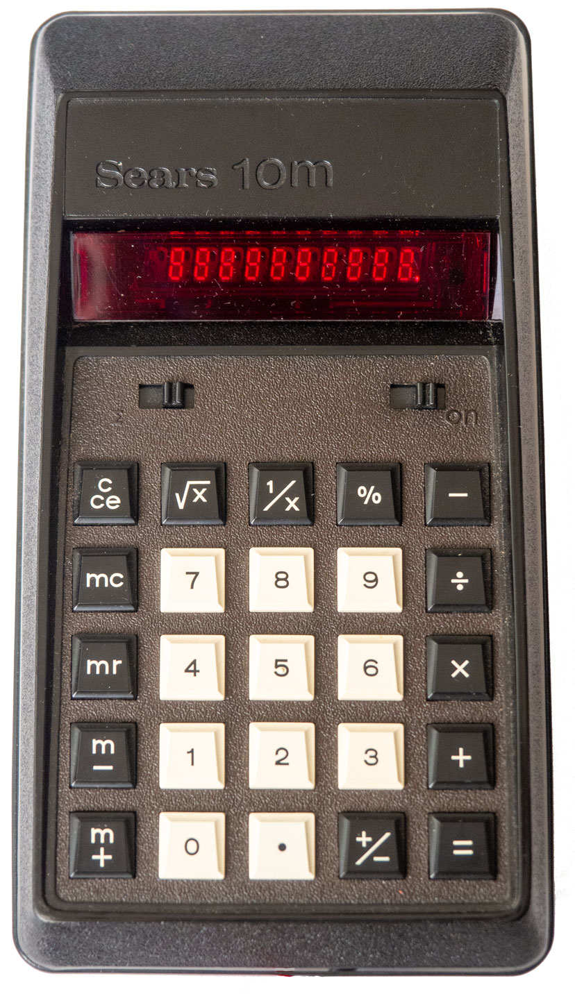 Sears 10m (Model No. 728.5825) (Large Image, Back, Internal, Box, Case) (1974) "Electronic Calculator with Memory and Square Root" sold by Sears, Roebuck and Co. The back plate states at the bottom "Made in USA" although on top of the back plate is an additional sticker that states "Assembled in Mexico." This calculator was originally purchased on July 5, 1975 from Sears for $39.99 according to the original receipt. Adjusting for inflation, that's equivalent to $239.09 in December 2025 dollars. I purchased the calculator with the original box, case and instruction manual on eBay on January 27, 2026 for $4.99 plus tax. Shipping was free! An AC adapter/charger was not included. Inside the calculator has three NiCad batteries which are a bit past their prime after 50 years! I tested the calculator with a temporary battery pack with three AAA NIMH batteries. NIMH batteries have the same nominal voltage as NiCad batteries of 1.2 volts. The measured voltage for the three freshly charged AAA NIMH batteries was 4 volts. The calculator worked with this battery pack attached to the positive and negative terminals inside the calculator. | The calculator, case and box are all in very good condition. The calculator has an "Optostic" red LED display. The calculator has a "large scale integrated circuit" which you can see looking sideways into the back of the calculator. I did not try and pry the circuit board off to view the inside further, however, for fear of damaging the calculator. I'll be on the lookout for another one which I might try and take apart since I have found any internal images on the Internet. Calculator.org and calcuseum.com have brief descriptions of the calculator.