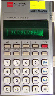 ![]() | Sharp EL-805, released May 15, 1973, this is the first Sharp LCD calculator and one of the first LCD calculators ever. The first is the Lloyd's Accumatic 100, produced by Rockwell in 1972, according to Vintage Calculators. My Sears C1 appears to be a variant of the Accumatic 100. See www.dentaku-museum.com (in Japanese). The EL-805 employed a crystal on substrate design with silver numbers against a black display. See additonal EL-805 pictures at datamath.org. The processor and LCD were on a single piece of glass. It used a tiny fraction of the energy of an LED calculator and could operate on a single AA battery for 100 hours. The back states it used .02 Watts which at the time was an amazing feat. The Sharp EL-811 above gives a power range of 1.3 to 1.9 Watts. | Datamath (go to "calculators related to TI") states the price was $110, nearly $500 in 2005 dollars! Sharp LCD Calculators and Vintage Calculators have excellent information about the history of Sharp LCD calculators. Wikipedia has information about LCD technology. Purchased on eBay on 11-27-05 for $26 with $6.50 shipping. Excellent working condition. (The display is fine. The photo is just fuzzy.) Excellent cosmetic condition except for light scratches on the back and a name and social security number lightly scratched onto the back. Soft case and instruction manual. Flip up cover over the display like the EL-808 below. Much smaller that the EL-808, with dimensions of approximately 8cm x 12cm x 2cm. | ||||||||||||||||||||||||||||||||||||||||||||||||||||||||||||||||||||||||||||||||||||||||||||||||||||||||||||||||||||||||||||||||||||||||||||||||||||||||||||||||||||||||||||||||||||||||||||||||||||||||||||||||||||||||||||||||||||||||||||||||||||||||||||||||||||||||||||||||||||||||||||||||||||||||||||||||||||||||||||||||