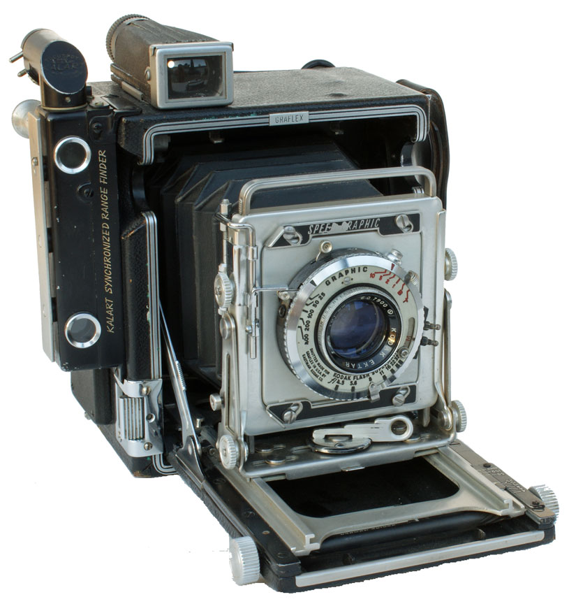 Graflex Speed Graphic (circa 1947) 3.25" x 2.25" Pacemaker Speed Graphic "press camera" made from 1947 to 1970. (I'm in the process of verifying the model.) Graflex.org states: "It was the dominant portable professional camera from the 1930's through the end of the 1950's." These are the cameras you see in the old movies with the flash bulbs popping. Viewing and focusing can be done in different ways. First, these are view cameras and hence you can view and focus using the ground glass on the back. It has a pop up device that covers the ground glass when closed. When opened, it serves as a shade for the ground glass. Second, you can view and frame through the viewing window on top. On the side is a separate "Kalart Synchronized Range Finder" to focus. Actual focusing is done by moving either of the two knobs in front which moves the lens forward and backwards on the rails. My camera has a Kodak Flash Supermatic shutter and Kodak Ektar 100mm f4.5 lens. There appears to be two sets of shutter speeds - fast speeds of 1/25, 1/50, 1/100, 1/200 and 1/400 second and slow speeds of 1/10, 1/5, 1/2 and 1 second. Apertures are f4.5, 5.6, 8, 11, 16, 22 and 37. My lens is serial number EO7900. According to the code at graflex.org, this means it was made in 1946. If this is true and if mine is indeed a Pacemaker model, it must be one of the earliest Pacemakers with the lens slightly predating the introduction of the Pacemaker model in 1947. There is no light meter or battery.