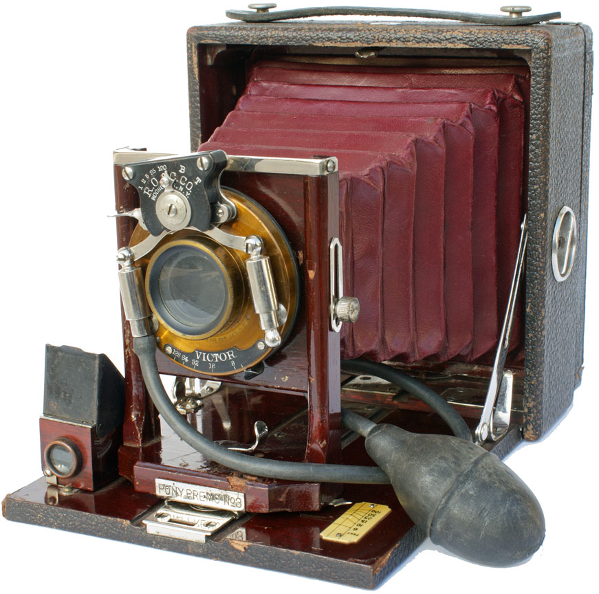 Rochester Optical & Camera Co. Pony Premo No. 3 (circa 1899-1903) Wooden drop bed folding 4" x 5" film format view camera made by R.O.&C.Co., which stands for the Rochester Optical & Camera Company. As explained by Rudolf Kingslake, A History of The Rochester, NY Camera and Lens Companies, in 1899 five Rochester, N.Y. companies formed the Rochester Optical & Camera Company. The assets of that company were acquired by George Eastman in 1903 and the name was changed back to the Rochester Optical Company, one of the original five companies. "In 1907 it became the Rochester Optical Division of the Eastman Kodak Company, and in 1918 the Rochester Optical Department." (See also Rochester Optical Co., Wikipedia.) Since mine has the R.O.&C.Co. initials just below the shutter speeds, I assume mine was made somewhere between 1899 and 1903, the years the Rochester Optical & Camera Company was in existence. I have put it under Kodak since Kodak eventually acquired that company and still made this model. It is beautifully crafted of wood, leather, brass, chrome and glass. The name tag on front says "Pony Premo No.3. On the front, top of the drop bed it says "The Premo Camera." The handle also says "Premo." Above the aperture settings it says "Victor." Just under the lens engraved into the brass it says "Bausch & Lomb Opt. Co. Pat. Jan. 6, 91." Bill Strong's Vintage Cameras indicates McKeown indicates this shutter was made in 1901 consistent with the 1899 to 1903 time period above. One of the three film holders which came with the camera has two dark slides with writing on them. One says "THE PREMO CAMERA, PAT. JULY 19, 1890, OCT. 14, 1902." The other dark slide is the same except instead of the October 14, 1902 date, it says "OTHER PAT'S PENDING."