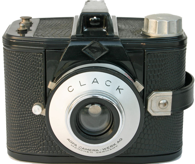 Agfa Clack (Large) inexpensive German consumer camera using 120 roll film with a 6x9cm frame. Produced between 1954 and 1965 by Agfa Camera-Werk AG in Munich. Mine appears to be a later version according to the discussion in Matt Denton Photo. It has two aperture settings - a smaller opening for "sunny" and a larger opening for "cloudy." It has a third setting for close-ups of 1-3 meters or 3 to 10 feet. It seems to be the same aperture as the "cloudy." The apertures and the close focus are done by a simple turret. According to Alfred's Camera Page the close focus is done by a supplemental positive lens. Single shutter speed of 1/35 second according to Matt Denton Photo along with a B setting. That site also says the "sunny" setting is f16 and the "cloudy" setting is f11. Matt Denton Photo indicates that despite being a very simple, inexpensive camera, it is capable of producing quite clear photos due to its large image size, small aperture and curved film plane which compensates for the simple lens. Since the shutter speed is so low, it is important to hold the camera still. Surprisingly for an inexpensive camera, it has a tripod mount and a remote shutter release socket. Since it takes 120 roll film, it can also easily be used today. Mine was purchased as part of a collection of 35+ vintage consumer cameras for about $200 from an ad on Craigslist on 6-27-08 in Oceanside, CA. It is in very good cosmetic and working condition. It needs an empty film spool.