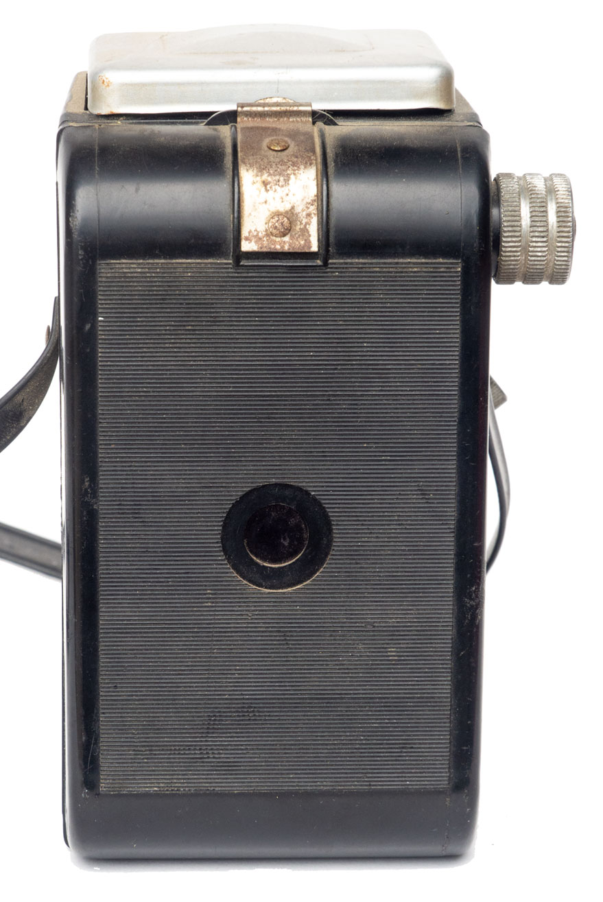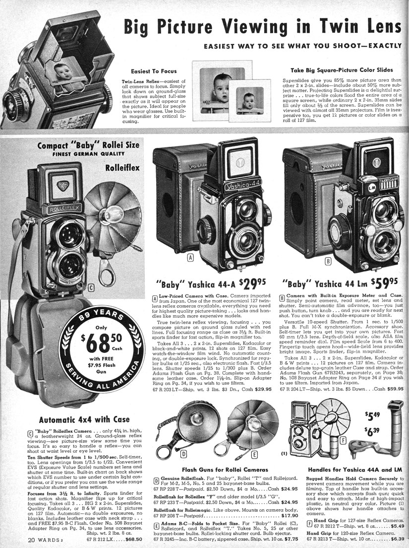 "Lowest priced flash camera with twin-lens reflex action. Has precision flash unit with hot flash bulb ejector as plus safety feature. 1 3/8 x 1 3/8 in. finder shows exact picture before clicking shutter. Twin Meniscus lenses - optically ground, pitch-polished - with built-in sun shade. Takes 12 2 1/4 x 2 1/4 pictures from 620 film. Handsomely styled plastic housing . . . satin-finish aluminum front. Complete with flash unit and neck cord."