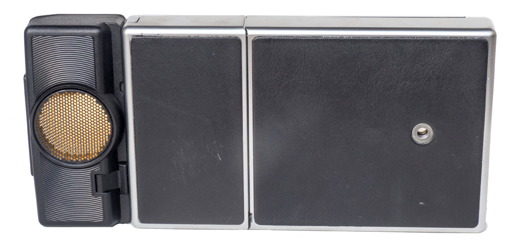 Polaroid SX-70 Sonar One Step (1978) (Large Image, Back, Other Side, Flat Bottom, Flat Top) A medium format instant film single lens reflex autofocus camera. Indeed, it is the first autofocus single lens reflex camera available to consumers predating by many years 35mm single lens reflex cameras such as the Minolta Maxxum 7000. (See Wikipedia - SX-70.) The 1978 date is from instantoptions.com/landlist which states the Sonar One Step is similar to the SX-70 Alpha 1 except it has autofocus using the Polaroid Sonar AF system. (See also Dan Finnen.) Full manual focus is also possible like the original SX-70. The original retail price was $249.95 or about $1,150 in March 2023 dollars. The manual is available at butkus.org. Page 4 of the manual explains the sonar autofocus. It works by releasing high frequency sound waves at the speed of sound (1,100 feet per second). The sound waves bounce off the subject. The camera's processor uses the time it takes for the sound waves to return to calculate the distance between the camera lens and the subject. A signal is sent to the lens motor to achieve the correct focus. All of this takes about 1/3 second. The Instant Camera Guy states: "it's one of the most accurate automatic focusing systems ever made, and will outperform most new digital SLRs. It can focus from infinity down to 26cm in under 1 second!" It can also focus in the dark since it uses sound, not light. The camera has a 4-element 116mm f/8 glass lens with shutter speeds from 1/175 to more than 10 seconds. Like the original SX-70 it folds flat although the camera is considerably bigger than the original SX-70 due to the sonar autofocus mechanism. My camera is in excellent condition and comes in the original box. I have not tested the camera since film is no longer available and the battery is contained in the film pack. From notes on the box and a price sticker it looks like it may have been purchased in March or April 1981 for $188 from a store called "The Treasury." While I'm not a big fan of Polaroid cameras, the SX-70 cameras are quite amazing with their folding design and big, bright SLR viewfinder. I also have the Polaroid Polatronic Flash #2350 "for Polaroid Sonar OneStep Land Cameras." The flash has a price tag of "$44.95" also from "The Treasury." The box for the flash indicates it was made in Japan and has a date of 11/78. The box for the camera indicates it was made in the U.S.A. I also have an unboxed "Polaroid Land Camera Time Zero SX-70 AutoFocus" camera with more wear. According to comments on reddit the two cameras are essentially the same with only cosmetic differences and different names. The Time Zero model will be slightly newer. "Time Zero" refers to the faster developing Time Zero SX-70 film that came out in 1981.