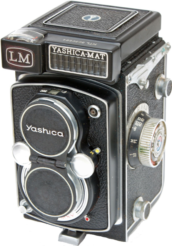 Yashica-Mat LM (1958-1962) Twin lens reflex camera made in Japan. Uses 120 roll film producing 6cm x 6cm (2.25" x 2.25") negatives (actual size 5.5cm x 5.5cm). The taking lens is a Yashinon 80mm f3.5. The viewing lens is a Yashinon 80mm f3.2. Yashinon lenses are quality 4 element lenses. Copal-MXV shutter. Shutter speeds of 1/500 second to 1 second. The shutter speeds are set by turning a knob between the taking and viewing lenses with your right hand. The aperture is set by turning a similar knob between the taking and viewing lenses with the left hand. The aperture and shutter speed are shown in a small window immediately above the taking lens. You focus using your left hand using the large knob on the left side (looking down on top of camera) of the camera. That knob also has a depth of field scale. You advance the film with your right hand using the crank on the right side of the camera. You fire the shutter release immediately below the taking lens on the right with your right hand. One turn of the crank also cocks the shutter. You lift the hood up to view and focus the image on the ground glass. The glass has 5x5 grid lines. You can put your eye up to the pop up magnifier for detailed viewing and focusing. Finally, for quick shots, you can look through the sports view finder. The LM stands for "Light Meter." The Selenium light meter is immediately below the Yashica-Mat name. The needle points to an Exposure Value (EV). You then use the exposure scale on the focusing knob. After setting the ASA to the ASA of the film, you match the EV number with the red dot on the outside ring. Shutter and aperture combinations for correct exposure are then shown. It's cumbersome, but is relatively easy and logical once you get the hang of it. You open the camera to load the 120 film using the latch on the bottom. The instruction manual is available at kyphoto.com.
