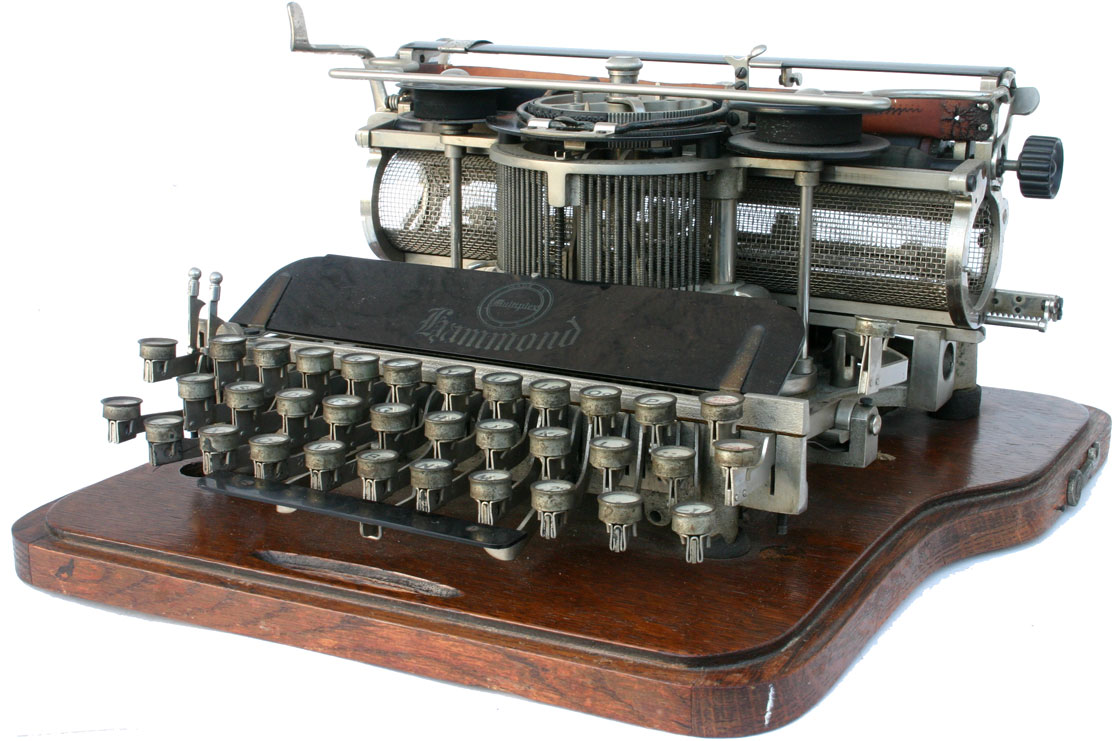 Hammond No. 12 (Large Image, With Base Removed, Bottom, Back, Case). According to The Classic Typewriter Page, the Hammond 12 was introduced in 1905 replacing the Hammond 2 which was introduced in 1893 or 1895. My Hammond No. 12 is serial no. 113413 stamped on the top left side and on one of the feet. Since The Typewriter Database does not have specific information on dates for given serial numbers for Hammond typewriters, I have not been able to pin down the date of manufacturer of my particular typewriter. It was likely made sometime between 1905, the date of introduction, and 1915, when the Multiplex model above was introduced. (See also George's Web Site.) Mine has a straight keyboard but there were also Model No. 12 variations with a curved keyboard. According to The Virtual Typewriter Museum, the Model 12 was the first Hammond "visible" typewriter allowing you to see what you were typing. It did this by lowering the ribbon when a key was released. Like the Multiplex above, this Hammond uses a single element design with a revolving type shuttle. The Hammond 12 could fit only one curved plate with the letters, while the Multiplex could fit two curved plates allowing for faster changes to other fonts. As indicated in The Classic Typewriter Page, Hammond typewriters continued as the Varityper into the 1970s. My Hammond 12 was a generous donation from a gentleman in Michigan in February 2014. While the typewriter was dirty (photo before cleaning), mechanically it seems to be generally sound although I do not have it working 100%. I cleaned and lubricated it. There is some minor rust. It came with most of the curved case. The front part of the case is missing. The sides and back are present, but broken. I partially glued them back together. The top part of the curved case is intact, although it has a large ink stain on it. There is a lighter stain on top of the ink stain. I don't know what the lighter stain is. The base is missing a piece on the side. The front part of the base was also broken, perhaps in transit to me. I glued this piece back in place. I have the cover loosely covering the machine to keep dust off of it. I think Hammond typewriters are one of the most handsome typewriters ever made with a wonderful combination of oak and metal, making this a wonderful addition to the Typewriter Museum! | |