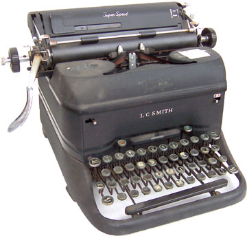 L.C. Smith Super Speed, purchased April 23, 2005 at a San Carlos (San Diego) garage sale for $10, the Super Speed model was introduced in 1937. According to the owner it was used at a fuel dock on the bay in downtown San Diego in the 1940s and 1950s. It is in good working condition although the keys are covered with tape, it could use a good cleaning internally and externally, there is some minor rust, and it needs a new ribbon. The footprint is roughly 15" x 15" (38cm x 38cm), the height is about 10" (25cm), and the weight is about 35 pounds (16 kg). While the front identifies the make as L.C. Smith, the back has L.C. Smith & Corona, which was later known as Smith Corona. According to The Typewriter Database, the Super Speed was made between 1937 and 1953. If I could find the serial number I could pinpoint the exact year of manufacture. A 1940 magazine ad describes the Super Speed as "... a sensational triumph of typewriter design . . . an executive's ideal of economy and efficiency . . . a secretary's dream come true!" | |