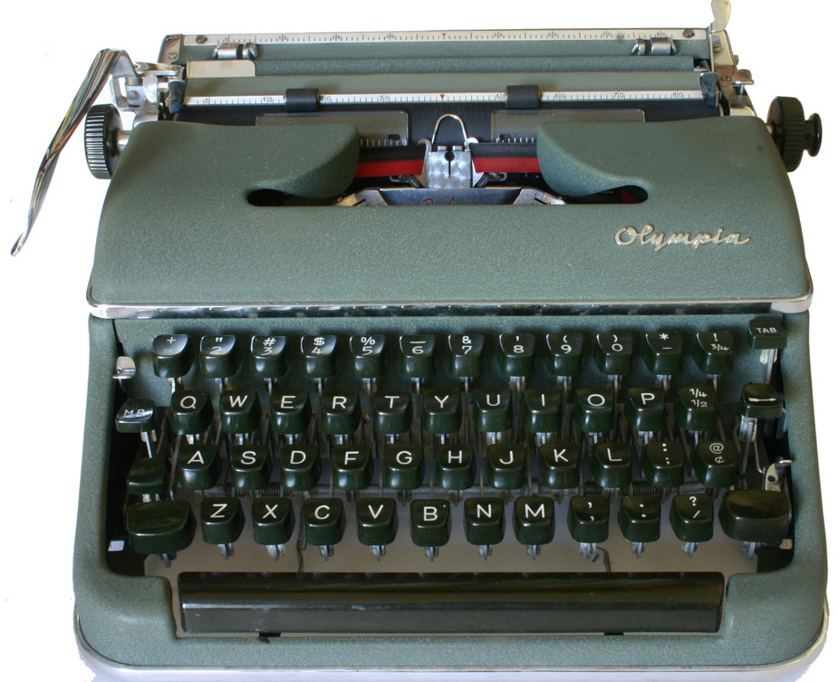 Olympia SG-1 (circa 1960) (Larger Photo) Date from The Typewriter Database. According to mytypewriter.com, the SG1 was produced from 1953 to 1964 with over 1 million sold in the United States. The color and styling are obviously very similar to the portable SM-3 above. Mytypewriter.com states it "was a full-fledged office-sized machine widely popular in the U.S for its quality and craftsmanship." The site continues stating it was an "industry workhorse, and truly a standard." Keystone Typewriter Co., Inc. calls it "the Mercedes Benz of typewriters" "made with West German craftsmanship." That site has a lengthy discussion of its many outstanding features including individual springs at the end of each typebar to cushion the typist's finger as a key is struck. "[T]his machine just glides smooth as glass when you type. It has the easiest touch of any desk model manual ever made." Id. Mr. Typewriter, referring to the SG-1 as a "classic beauty" has photos showing disassembly for cleaning and notes that the 1960 price of a new SG-1 was $225. That's equal to $1,672 in 2008 dollars, the price of three budget personal computers and all-in-one printers. The SG-1 is also featured at Back Space Typewriters.The name plate on the back of my SG1 typewriter states it was made in Western Germany by Olympia Werke, AG. WILHELMSHAVEN. Distributed by Inter-Continental Trading Corporation, 90 West Street, New York 6, N.Y. I purchased my SG-1 on 8-31-08 for $15 at an estate sale in a neighborhood of very expensive homes on Valle Verde Road in Poway, CA. It is in very good cosmetic and working condition. All keys work perfectly. It needs a new ribbon. Some of the sound proofing foam inside is deteriorating to the touch, but is not flaking off. I blew out a lot of eraser residue - proof of the agony associated with typewriters in the old days! It weighs about 38.2 pounds on the bathroom scale. It is a fine example of a top-notch, full featured, desktop manual typewriter. | |
