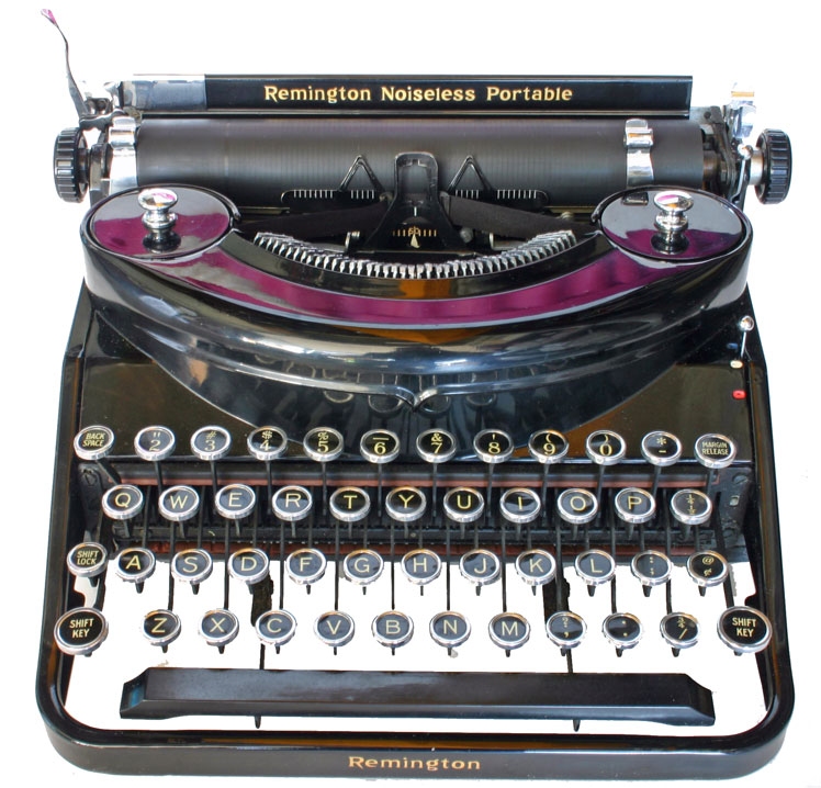 Remington Noiseless Model Seven (1948) (Large image) According to The Classic Typewriter Page - Remington Portables, the Remington Noiseless Model Seven portable typewriter was originally made from November 1931 to March 1941 with an original price of $105 reduced to $72 by 1935, apparently as a result of deflation during the Great Depression. (Typewriters were expensive. $105 in 1931 has the same buying power as $1,493.33 in 2009!) According to that site, the original serial numbers were H10000-H63756 with 53,757 made. The Model 7 is a larger version of the similar Remington Noiseless Portable above. The Classic Typewriter Page - Remington Portables also indicates the Remington Model 7 was revived after World War II in a black wrinkled paint version with other stylistic differences. The post-war serial numbers are H64000-H193575 indicating another 129,575 were made after the War. Mine is the post war version with a serial number of H170391. According to The Typewriter Database that makes mine from 1948. It is in very good working condition and comes with the case in good condition. All keys work well. As noted with the Remington Noiseless Portable and the Underwood Noiseless, the keys appear not to hit the platen. They do, however. Therefore you don't need to strike the keys too hard. Mine was purchased on December 5, 2009 for $22.50 on the last day of the estate sale of the famous amateur filmmaker Sid Laverents at his home in Bonita, California. (See Bruce Weber, "Sid Laverents, Auteur of Homemade Films Dies at 100, N.Y. Times May 16, 2009).) It was the last day of the sale and the typewriter was 25% off its posted price of $30. I also purchased an Olivetti Lettera 33 for $13.50. The discussion of the Olivetti Lettera 33 has more information on Sid Laverents. | |