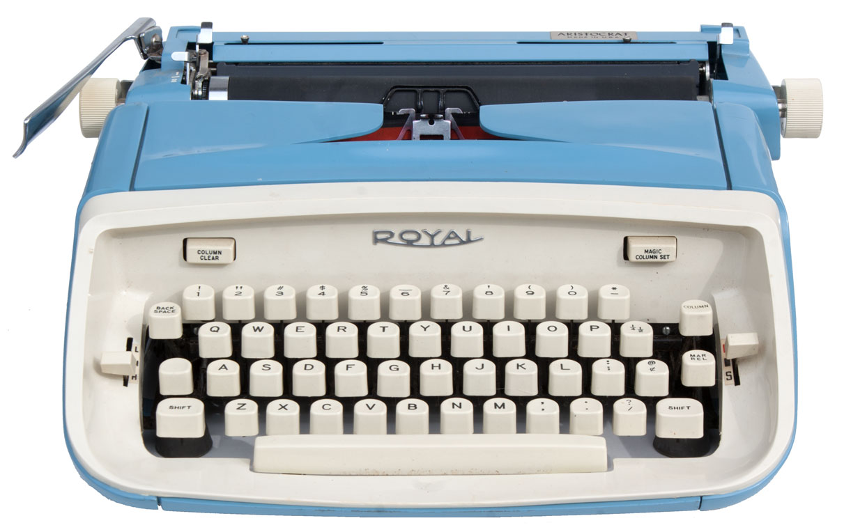 1965 Royal Aristocrat (Large Image) This script font typewriter was delivered to the original owner on October 4, 1965. The serial number A15940915 is located under the carriage on the left. The box and case were damaged in transit, but the typewriter was not damaged. The purchaser asked for a new case. Since the case I have is in great condition, his request was apparently eventually granted. The correspondence appears to have been typed with this typewriter and provides a nice sample of the script typeface. The Aristocrat model name may have been used since the 1920s. The Typewriter Database refers to "Portable Standard, Arrow, Speed King, Aristocrat, and Quiet DeLuxe" models going back to 1927. Mr. Typewriter has a 1941 model and refers to pre- World War II models. The Aristocrat was apparently the high end version of portable line at any given time. A Royal Quiet Deluxe and an Aristocrat would be largely the same machine, but the Aristocrat would have a few more features. For example, a 1950s Aristocrat looked like my 1952 Royal Deluxe above. Vintage Typewriters has a 1963 Aristocrat like mine and states it looks almost identical to the 1963 Royal Safari. The styling change from those made in the 1950s compared to the 1963 and later Aristocrat typewriters was rather dramatic. I like the sculptured front and the bright baby blue or sky blue color. While it has the fashionable space age or atomic age look to it, Royal emphasizes below the Aristocrat name that it is still "made in the USA" and on the back that it has "rugged Royal all-metal structural design." The "all-metal structural design" apparently allows for the white plastic front. It is a solidly made machine that types well. Mine is in excellent cosmetic condition with just a few scratches from putting it in and out of the case. It is also in excellent working condition except the "2" key often hits the cover when coming up. My typewriter has a "1" key. An earlier 1963 Aristocrat sold on Etsy.com did not have a "1" key instead having the user use the small letter "l" key instead. Perhaps squeezing in a "1" key is the cause of my adjacent "2" key hitting the cover when it comes up. My 1965 Royal Aristocrat came with the case in excellent condition and the original paperwork including the warranty card, the instruction booklet/poster (Reverse Side), "The Speed Typing Chart," the 1954 "Touch Typing in 5 Easy Lessons," and the correspondence regarding the damage to the original case. I purchase it for $5 at a January 14, 2012 garage sale on Jackson Drive in the San Carlos area of San Diego. I also purchased a Smith-Corona portable and Sears branded Smith-Corona portable, both also likely from the 1960s, for $5 each at the same garage sale. | |