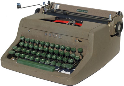Royal Model 10 (1922) double beveled glass side window model and according to The Typewriter Database manuafactured in 1922 (serial number X 728380) making it my oldest typewriter by two years. Purchased for $20 on August 5, 2006 at a garage sale in the San Carlos area of San Diego. It is in good cosmetic and working condition although it needs a new ribbon and a good cleaning. There is considerable rust on the unpainted surfaces, but much of it seems to be surface rust. All of the keys work. The typewriter was used in seller's family business back east and was acquired with the business. Large View, Side View, Back View. | |