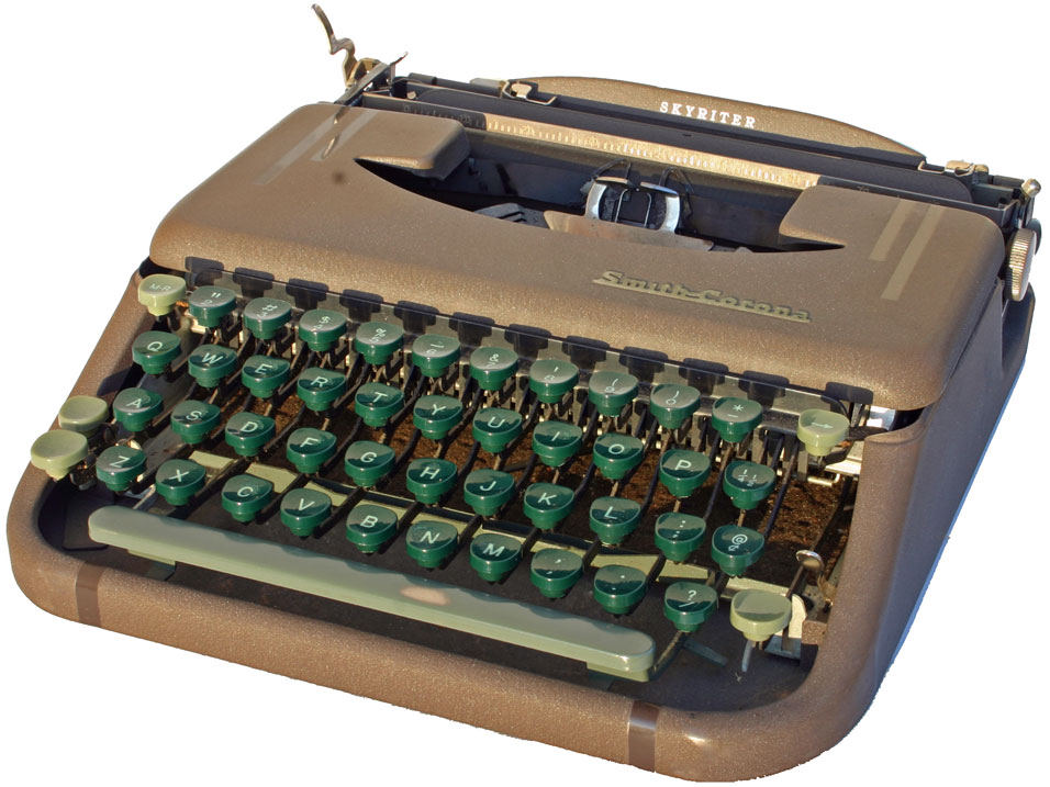 Smith Corona Skyriter (circa 1950) (Large Image) I couldn't find the serial number for the date, but it looks like the 1950 model at Will Davis - Smith Corona Portables. In good cosmetic and working condition with the exception of a few sticky keys and a sometimes slow space bar. I haven't lubricated it yet. Several black and white photos of a similar one at www.warrenworks.com. The Skyriter, and the rest of the 1950's Smith Corona portable lineup, are labeled as among the best manual typewriters to use today at the Best Typers page. A 1954 ad is available at eBay Express for the 1950s lineup. The Skyriter is very small at about 12" x 11" x 3.5" with its metal cover on. It's the perfect 1950s laptop to take aboard that Douglas DC-3 prop plane or, by 1958, a Boeing 707 jet. (See U.S. Centennial of Flight Commission, The Opening of the Commercial Jet Era.) Purchased at the Salvation Army Thrift Store in the Rolando area of San Diego on 8-4-07 for $25. | |