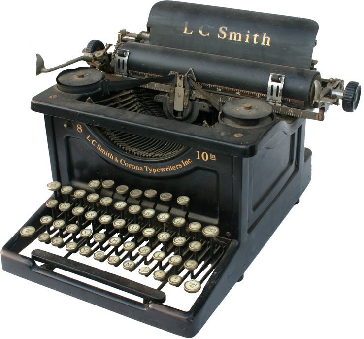 L.C. Smith 8-10 (Large Image) (1929) L.C. Smith Model 8 with a 10 inch platen. The L.C. Smith No. 8 in some form appears to have been made from 1915 to 1936. According to The Typewriter Database mine was made in 1929. These machines originally were made by L.C. Smith. By 1926 L.C. Smith had merged with Corona. Therefore, while this says L.C. Smith above the platen, it says "L.C. Smith & Corona Typewriters Inc." on the front. Earlier models were open on the sides as shown at S.L.Johnson Typewriters Collection, mellow60s.com and Powerhousemueseum.com. My No. 8 weighs in at over 30 pounds! Typewriter.be has a nice discussion about the 8-10 and the similar 8-11 Secretarial including vintage ads. Will Davis L.C. Smith Gallery also has the 8-10 and other L.C. Smith machines. Mytypewriter.com has a No. 8 as well as a later No. 8 Silent which looks quite different. My No. 8 was purchased through an ad on Craigslist in the Clairemont area of San Diego on 6-13-08 with 4 other typewriters and an adding machine, all of similar vintage for $75. I think we allocated between $5 to $10 for this machine. It is in good cosmetic condition - some loss of decals, minor rust and dirty but generally okay. Also, curiously, several of the letters on the keypads are rotated. It is in good operating condition except the ribbon doesn't rise up. You can manually move it up so the keys strike it, however. It also needs a new ribbon. | |